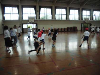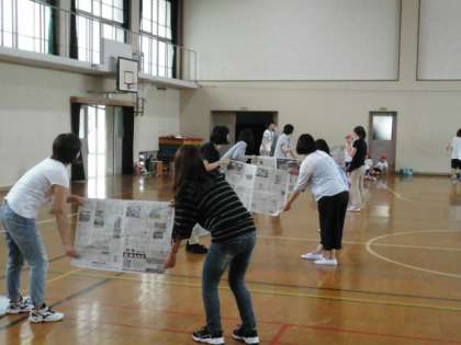 新聞突破リレーはお母さん方が持ってくれている4枚の新聞の壁を,走って突破する楽しいリレーでした。親子入り混じってのドッジボールは,子供たちの容赦ないスピードのボールに右往左往しながら,大人も子供も汗をかきながら楽しくできたと思います。お忙しいのにたくさん参加していただき,ありがとうございました。役員の方々企画から準備などお世話になりました。