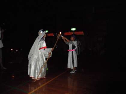 山の家,最後の夜はキャンドルファイヤーでした。火の女神から4つの火を受け取りました。キャンドルの明かりの中,レクレーションの係の子どもたちを中心に楽しむことができました。
