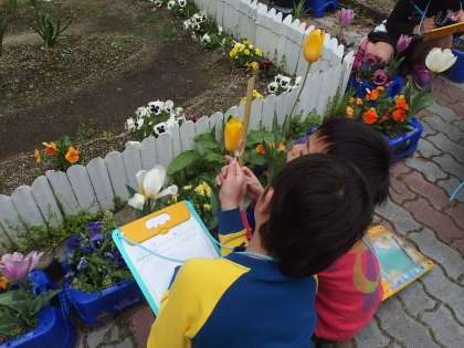 さっそく,境谷小学校にいる生きものの観察をしました。