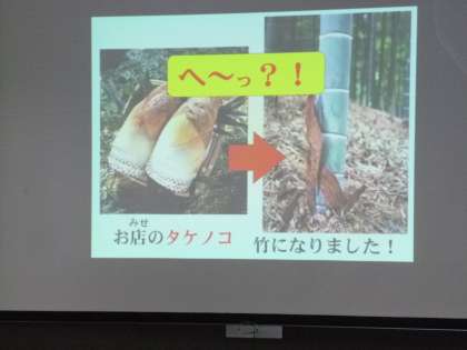 総合的な学習「竹はかせになろう」の調べ学習のため,洛西竹林公園に校外学習に出かけました。竹林公園では竹の先生が待っていてくださり,映像とお話で竹のことを詳しく教えてくださいました。子どもたちは一生懸命メモを取りながら竹の先生のお話を聞き,疑問に思ったことを質問していました。