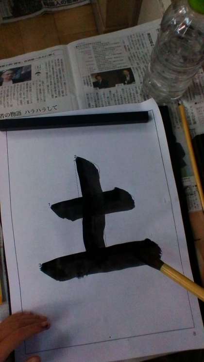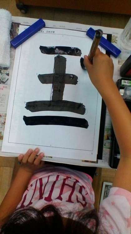 「土」の練習の2回目です。少しずつ筆のもち方,動かし方がわかってきて,形よくかける子どもも出てきました。良い作品に仕上げようとがんばって練習しています。