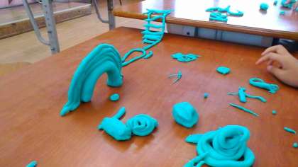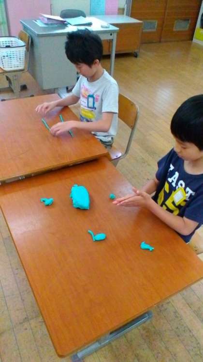 今日の図工では,ながーーーーーく伸ばした粘土を使って作品作りをしました。
