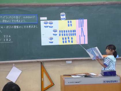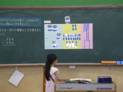 「たし算とひき算の筆算」の学習をしています。今日は,(3けた)−(3けた)で繰り下がりのあるひき算に挑戦しました。今まで学習したことを使って問題を解き,考えたことをみんなの前で上手に発表しました。
