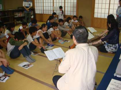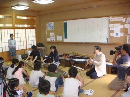 この企画は,子どもたちに文化芸術に親しんでもらう京都市教育委員会の「ようこそアーティスト」事業の一環です。この日は,6年生の子どもたちが参加いたしました。まず,古典邦楽の伝承活動を行う一般社団法人「京都當道(とうどう)会」の演奏者3名の方の演奏を聴かせていただきました。琴と尺八の演奏に魅了されました。