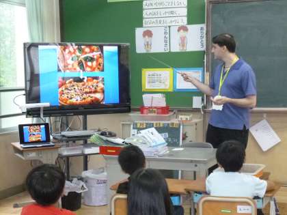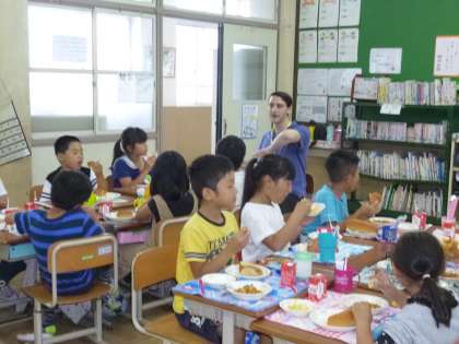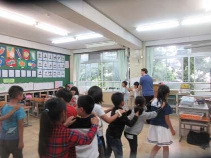 最後に留学生の方と一緒に「かもつれっしゃ」をしました。給食も一緒にいただき,楽しい多文化交流となりました。