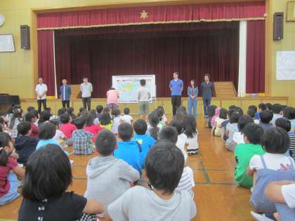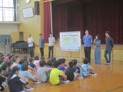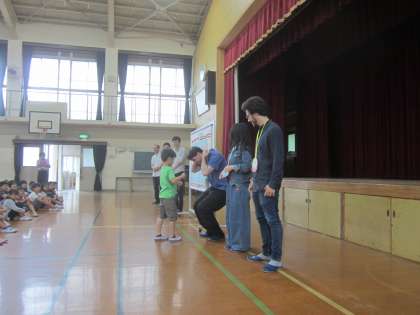21日の3校時,体育館で多文化交流会が行われました。いろいろな国から来られた留学生の方を迎え,2年生は手作りの名札を渡し,握手をしました。