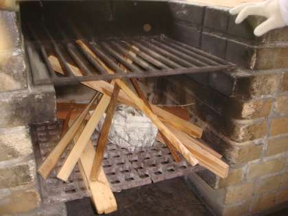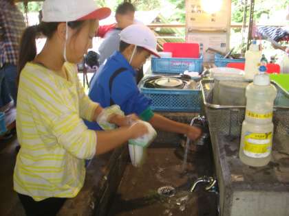 はじめに,食器やおなべを洗っていきます。また,火の係りの子どもは,かまどにまきの準備をします。