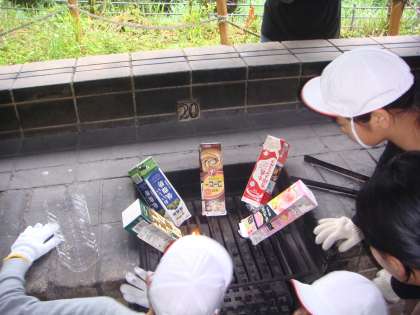 パンにキャベツソーセージをはさみます。それをアルミホイルでくりみます。そして,1リットルの牛乳パックの中に入れて火をつけます。