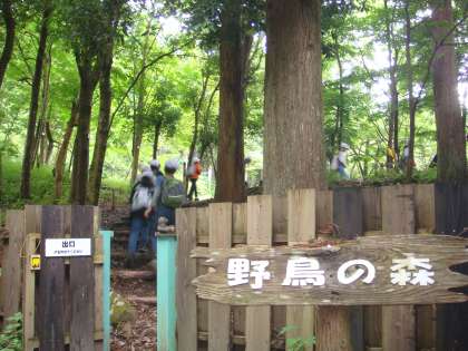 山の家の施設の中をいろいろと案内をしていただきました。キャンプネームは「バード」さんです。バードさんに,たくさん質問をしていた子どもたちです。
