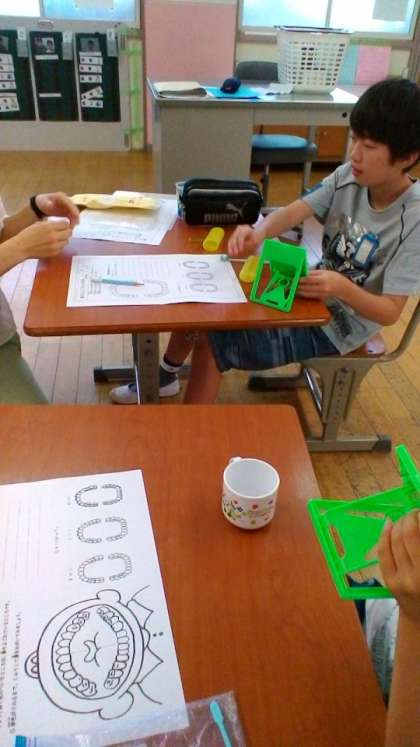 今日あおぞら学級では,養護教諭の先生に歯みがき指導をしていただきました。