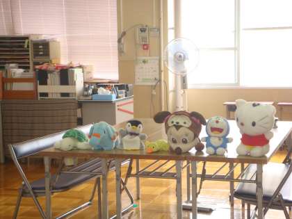 「この問題なら,保健室に入って探すのかなあ。」と考えながら保健室をちらりとのぞくと,ちゃんとこちらをみてくれるぬいぐるみたちがいました。