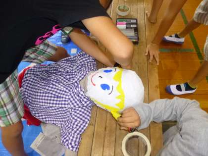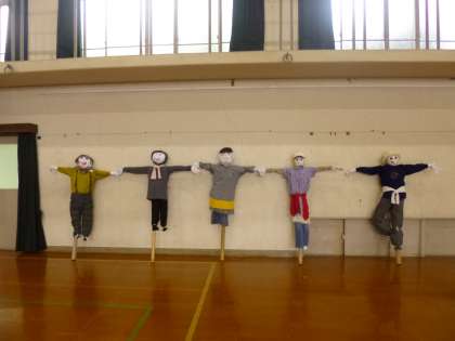 総合的な学習の時間に,地域の『なんやかんや「大原野」推進協議会 かかしチーム』の方々に教えてもらいながら,かかし作りをしました。それぞれのグループ毎に一体,個性的で素敵なかかしが出来上がりました。