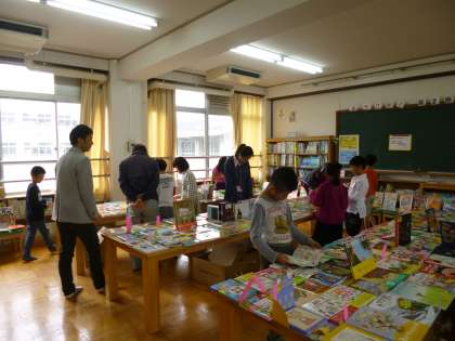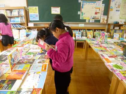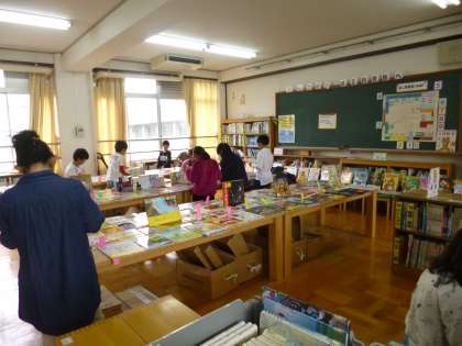 書店の方にご協力いただいて,たくさんの新しい本が並びました。たくさんの本の中から学校図書館に買ってほしい本を,一人3冊選んで,しおりをはさんでいきます。どの本がいいか真剣に,そして丁寧に選んでいきました。