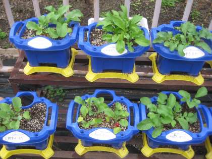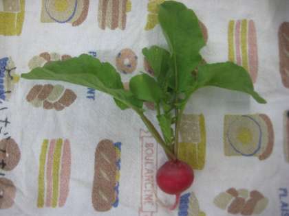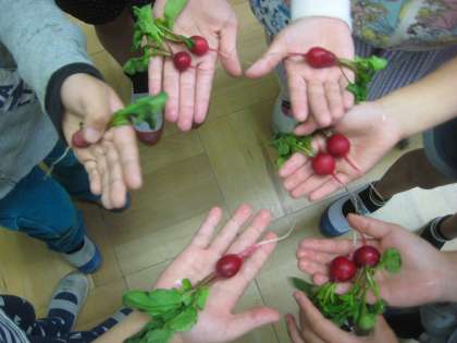 9月に植木鉢に種まきをしたハツカダイコンが,食べ頃になりました。鮮やかな赤いダイコンができて,とても美味しそうです。お家でサラダにしたり,葉っぱはお味噌汁の具にしたりして食べています。