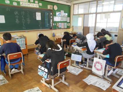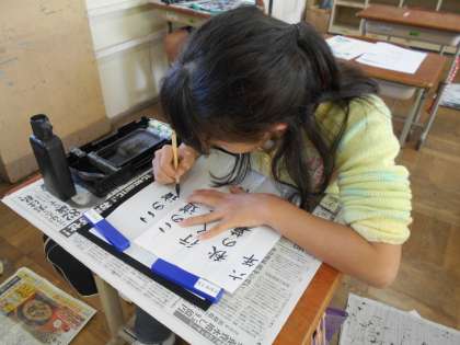今日の書写の学習では,「字配りと点画のつながりに気をつけて書こう」というめあてで,毛筆の学習をしました。