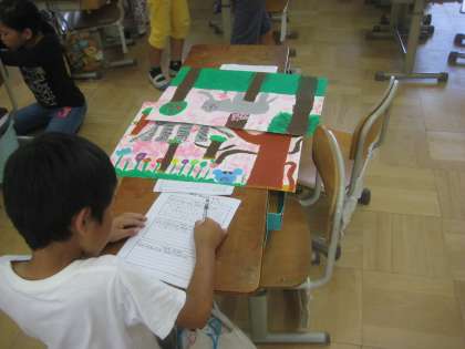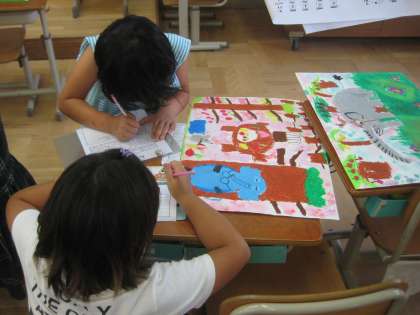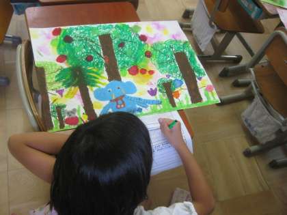 『だいじょうぶだよ ゾウさん』のお話を聞いて,絵を描きました。出来上がった友達の作品を鑑賞し,感想を書きました。同じ場面を選んでいても,それぞれ表現の仕方が違います。友達の絵の良さを見つけながら鑑賞をすることができました。