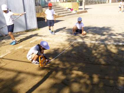 はばとびの学習に取り組んで,5時間目です。計測,砂ならし,合図,記録の仕事も,協力しながらスムーズにできるようになってきました。片足踏み切り,両足着地を意識しながら,記録に挑戦しています。