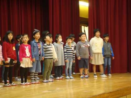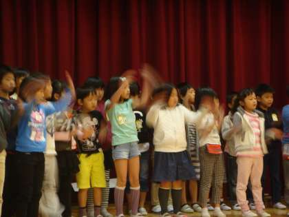 練習が終わって教室にもどる子どもたち。「どうでしたか?」とわたしにだずねにきます。「みなさんの学年は,1・2年生でしたか?」「うん。そうです。」「あれれ?もっと上の学年ではありませんか。あんなすばらしいダンスと歌声は・・・・。」と話しているととってもうれしそうな表情です。「でも,今日は,あんまり声がでなかったの。」「せりふもちょっと忘れてて。」ということを次々に言ってくれます。