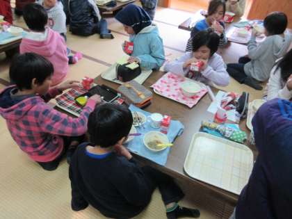 毎週木曜日は各クラスのランチルーム給食にお邪魔して,交流給食をしています。