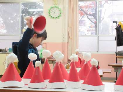 クリスマス会の帽子作りの様子です。
