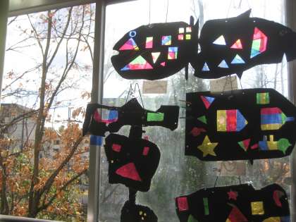図画工作の「ひかりのプレゼント」の作品を教室の窓に飾りました。太陽の光が当たると,きれいな影が床に映ります。太陽の光で色彩に囲まれた,すてきな教室になっています。