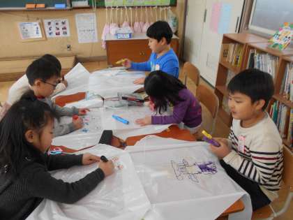 生活で「冬もげんきに」という学習をしています。子どもたちにお正月遊びのことを聞くと,「こままわし」「羽つき」「ふくわらい」「カルタ取り」「たこあげ」と,たくさんの遊びが出てきました。その中の一つ,たこあげをしようということになり,思い思いのたこを作りました。来週天気の良い日にみんなでたこあげをします。色とりどりのたこがどのように空にあがるのが,今からとても楽しみです。