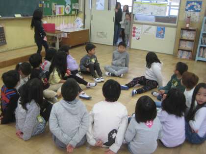 冬の日には珍しく一日中雨が降った日に,みんなあそびを教室でしました。ハンカチ落としで,外で遊べない分パワー全開で遊びました。