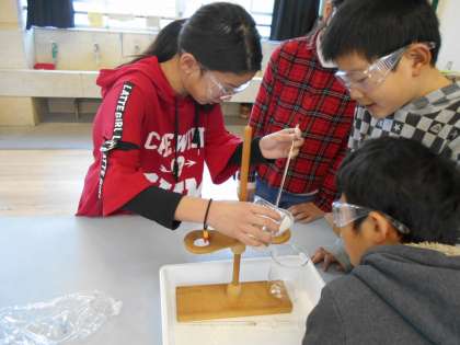 その後、ろ過の仕方を学び、自分たちでも上手にろ過することができました。目に見えていたホウ酸をとりのぞいた後の透明なろ液。このろ液にはもうホウ酸は溶けていないのか・・・新たな疑問が子どもたちの中に生まれました!さぁ、次の時間は、その疑問を解決していきましょう!!