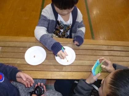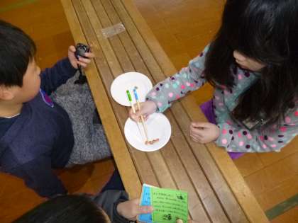 中間休みに給食委員会主催のまめつまみ大会がありました。今日は中学年の日です。5つの豆をおはしでつまんで,30秒間で左の皿から右の皿に移します。おはし使いが上手で,15秒ほどで全部を移せる子,なかなかうまくつまめない子など,一人一人のおはし使いの様子がよくわかる大会でした。