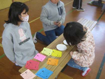 給食週間で,豆つまみ大会が行われました。おはしの持ち方に気をつけて,30秒以内に4粒の豆を隣のお皿に移します。うまくできたら給食委員の人からごほうびカードがもらえました。
