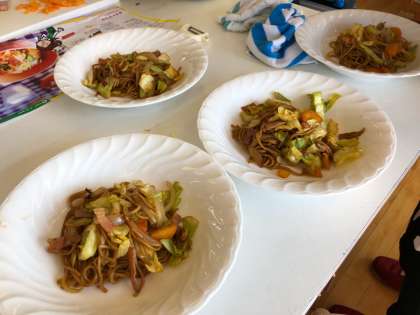 野菜がたっぷり入った焼そばと,ジャコ・ツナ入りポテトサラダの完成です!