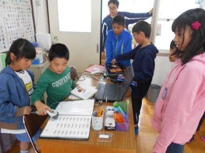 次に貸出・返却の練習をしました。みんなの憧れのバーコードリーダー!うれしそうに操作していました。1年間,充実した委員会活動になるよう,みんなで力を合わせてがんばりしょう。