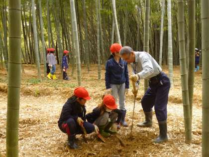 地域の方々にお世話になり,今年も,たけのこほり体験をさせていただきました。友だちと協力したり,地域の方に手伝ってもらったりしながら,たくさんのたけのこが収穫できました。