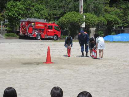 今年は訓練の最後に,代表児童による消火器を使った消化訓練を行いました。