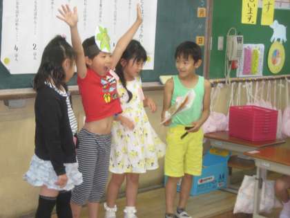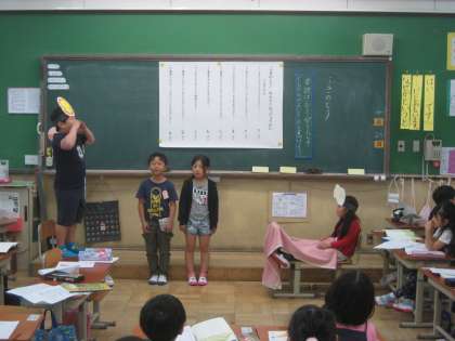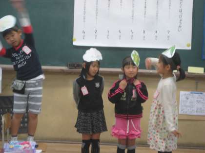ふきのとうの音読発表会をしました。おめんをかぶると,役になりきることができます。名演技がいっぱいの楽しい音読発表会でした。