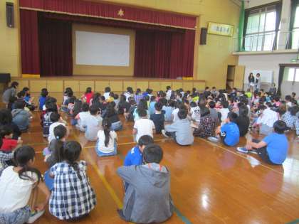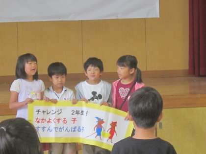児童朝会で学年目標の発表をしました。全校の前で大きな声で発表ができました。