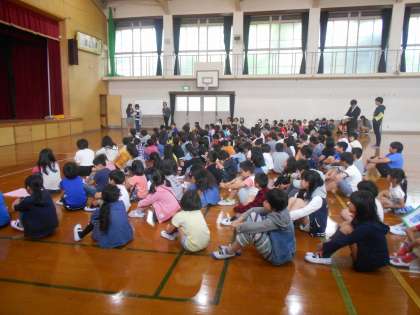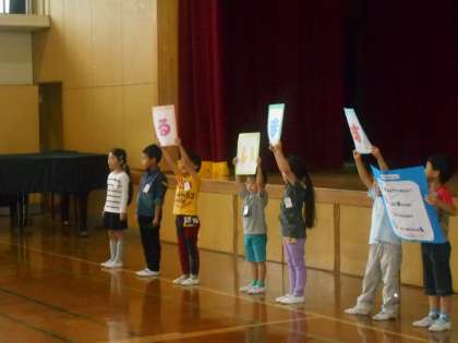 初めての児童朝会がありました。初めての児童朝会では,各学年ごとのクラス目標発表がありました。1年生は,7人の代表の子たちの言葉にあわせて,クラス目標を全員でしっかり言うことができました。「す・ま・い・る」のクラス目標の下,笑顔いっぱい,仲の良いクラスになってほしいと思います。