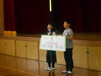 学級目標の発表をしました。新学期が始まって1か月あまり。全校の前で発表することで,改めて,「今年1年間目標に向かって頑張ろう」という気持ちが持てたのではないかと思います。