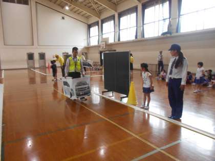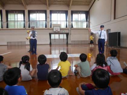 歩道の安全な歩き方,交差点の渡り方など実践を交えてわかりやすく教えてくださいました。1年生たちは真剣な表情で静かに話を聞いて,警察署の方から教わった通り「右・左・右」と車が来ないかどうか左右をしっかり確認しながら歩くことができました。