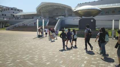 名古屋市科学館前の公園で昼食を食べ終え,名古屋港水族館に到着しました。どんな生き物に出会えるのか楽しみです。
