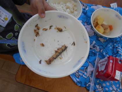きれいに残ったお魚の骨を「すごいでしょう!。」と