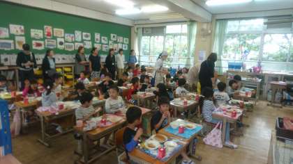 その後は,1年生の配膳や食事の様子を参観していただいた後,子どもたちと同じ給食を試食をしていただきました。「子どもも言っていた,給食の味付けは家と違い,苦手なものも食べられるという意味が分かりました。」「1日の3分の1の栄養を給食で補えると聞いて安心しました。」などの感想を述べておられました。