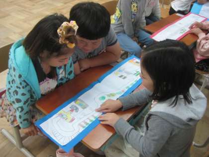 家から学校までのたんけんマップを作りました。登校中や帰り道で見つけた目印や自然など,いろいろな発見があります。自分が作ったマップを使って,通学路で見つけた『すてき』を友達にお話ししました。とても楽しい時間でした。これから町たんけんに広げていきます。