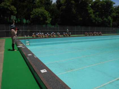 準備運動,プール内でのきまりについてみんなで確認した後,