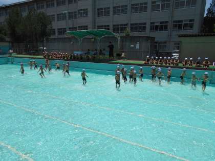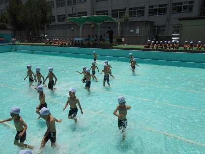 初めての学校の大きなプールに大感激の子どもたち。