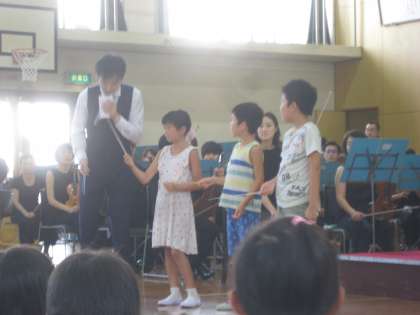 体育館でフルオーケストラの演奏を聴きました。間近で見る楽器の音色は心地よく,演奏者の息づかいも聞こえてきます。体験コーナーでは,低学年・中学年・高学年から代表1人ずつ出て,指揮をしました。ハーモニーの美しさに,暑さを忘れるひと時でした。