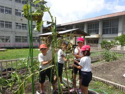 9月5日。前日の台風の影響が心配されましたが,3年生は全員登校してくれました。みんなの元気そうな顔を見て安心しました。しかし,台風の猛威は3年生の育てていた農園をグシャグシャにしてしまいました。先日授業で観察したオクラとヒマワリが強風で倒れてしまったのです。朝,みんなにその報告をすると「残念だね。」「もう観察はできないのかな。」など,元気のない声が返ってきました。ところが,中間休みにフラっと3年生農園を見てみると,何人かの3年生が一生懸命作業に取り掛かっていたのです。急いで駆け寄ると「先生!ヒマワリが復活しました!」「オクラもこの後復活させます!」と言ってくれました。みんなのパワーに驚きです。台風にも負けない,3年生の素晴らしい姿を見ることができました。