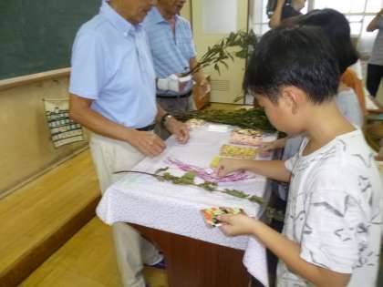 洛西ニュータウン創生推進連絡会の皆さんをゲストティーチャーに迎え,フジバカマを使った匂い袋作りをしました。あらかじめ乾燥させたフジバカマの葉とティーパック,布袋,ひもを準備してきていただき,匂い袋作りがスタート。乾燥させたフジバカマの葉は桜餅のような良い香りがしました。昔の人はこの香りを楽しむために匂い袋を作り,着物にしのばせたりしていたのだなぁと,昔の人の生活にもおもいをはせながら,匂い袋を作っていきました。