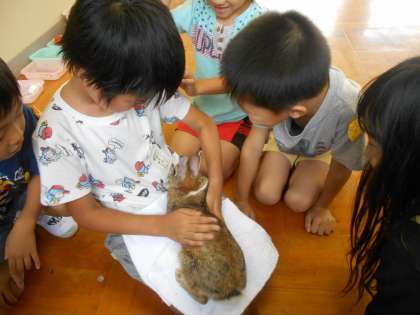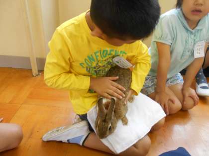 抱っこした後,子どもたちに感想を聞いたところ,「緊張したけど,ふわふわしてとてもかわいい。」「ドキドキ心臓の音が聞こえるよ。」など喜びの感想がたくさんありました。ぬくもりや鼓動を肌で感じたことで「命」の尊さについて考えることができました。