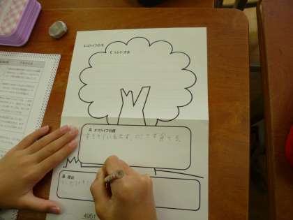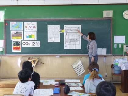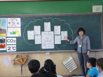 気候ネットワークの方をゲストティーチャーに迎え,エコライフチャレンジの振り返り学習をしました。夏休みに取り組んだエコライフの診断表をもとに,これからの目標や取組を考え,エコライフの木を完成させました。みんなでエコライフに取り組むことの大切さや続けることの重要性に気付くことができました。